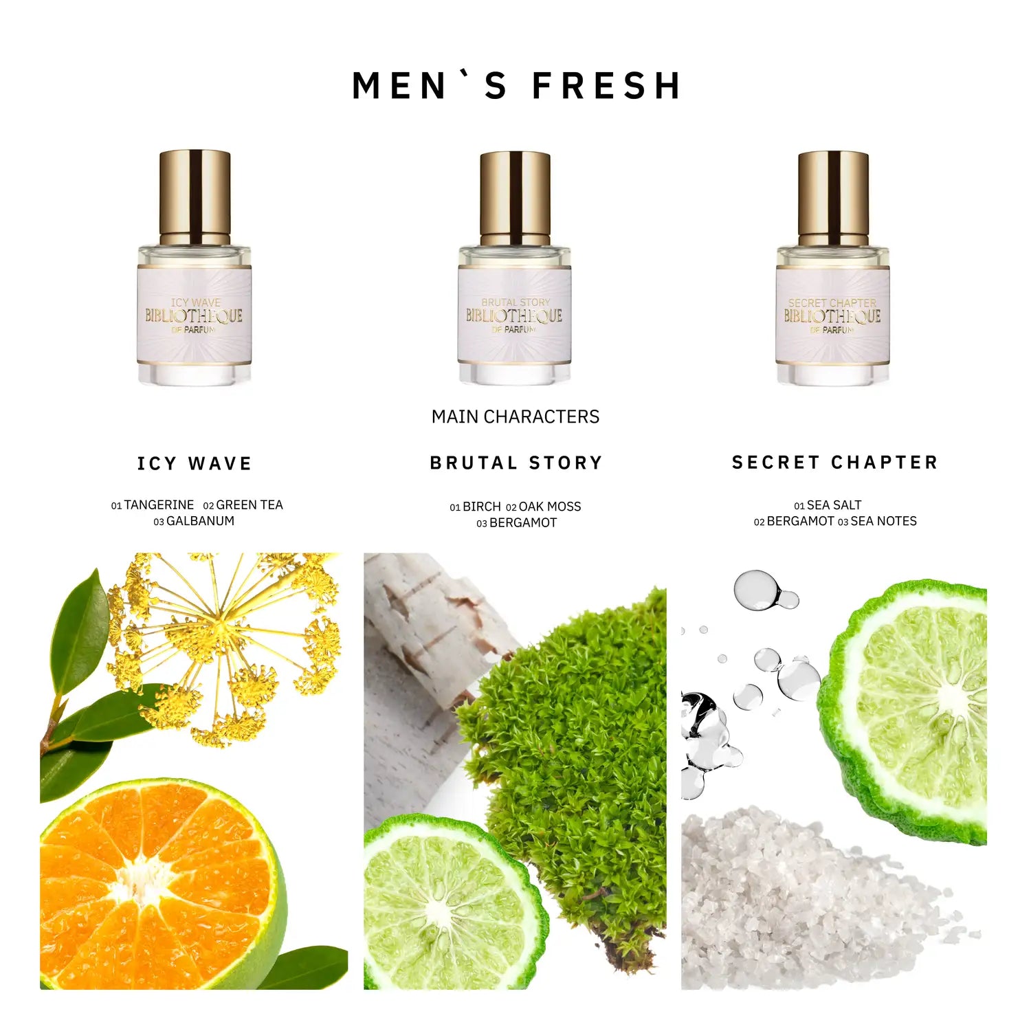A fresh marine fragrance, vibrant, citrusy, and airy with a soft salty-woody trail.