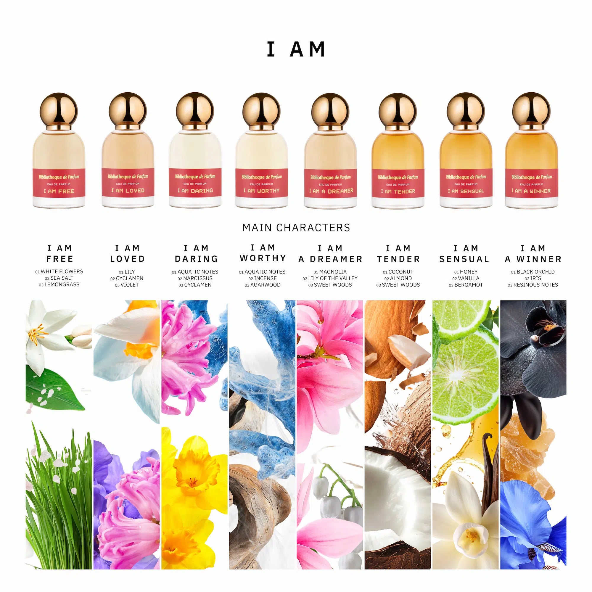 Acht Parfums der „I Am“-Kollektion verkörpern die acht Facetten einer Frau und wirken wie Anker. Sie können sich in jede Frau verwandeln, die von Natur aus in Ihnen schlummert, aber in diesem Moment auf die Bühne treten muss.